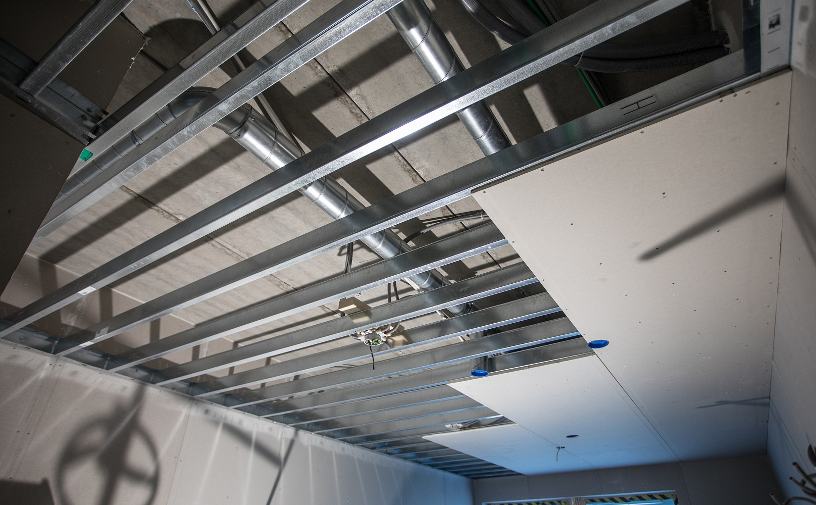 In the two northern towers, Botrygg has chosen to build free-standing suspended ceilings instead. The apartments are relatively narrow, which means that the span can be easily constructed without any additional measures. Another simplification is that they have chosen to build these with WallClick rails. This has proven to be quick, easy, and effective.
